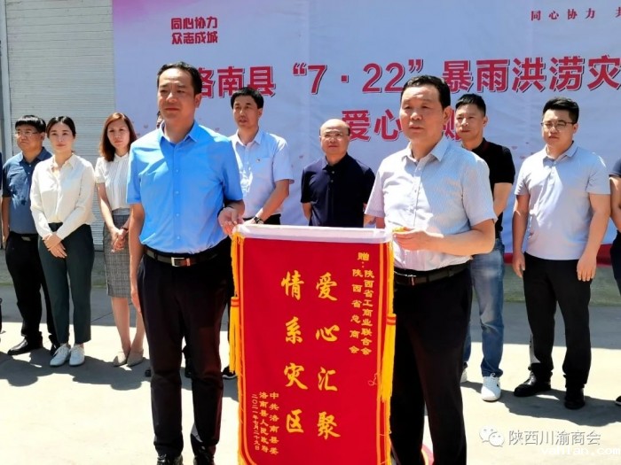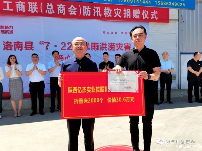 为了支援洛南县等地防汛救灾工作,表达对灾区人民的牵挂和支持,新利luck全站登陆积极号召会员企业向灾区捐款捐物,会长单位亿杰控股集团积极落实省委、省政府部署,积极响应向灾区捐款捐物的号召,向受灾严重的洛南灾区捐赠价值30余万元的2000张折叠床。7月29日,陕西省工商联党组成员、专职副主席许孝军与新利luck全站登陆会长、亿杰控股集团董事长陈高志等企业家亲自带队赶往洛南灾区,捐赠14辆车的救灾物资。
