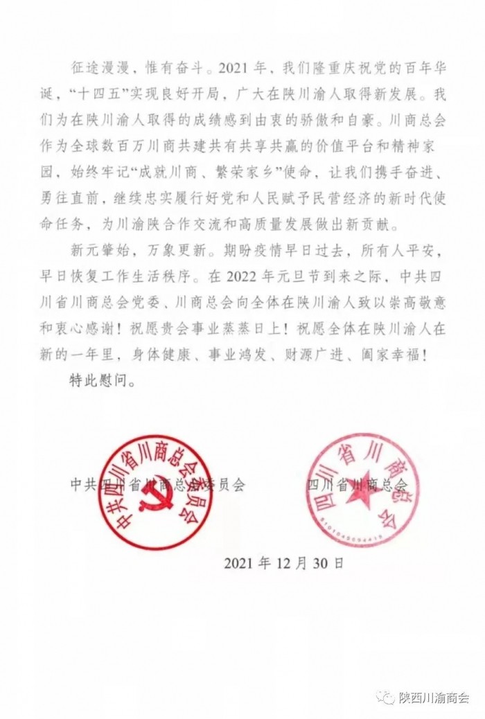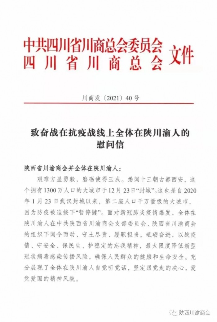 中共四川省川商总会委员会——致奋战在抗疫战线上全体在陕川渝人的慰问信