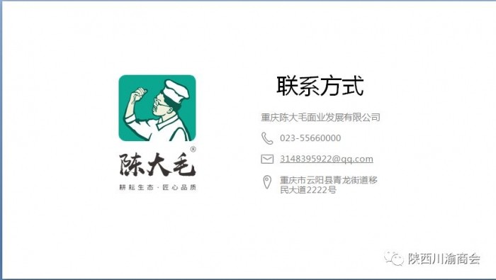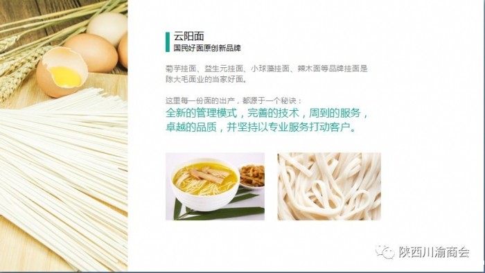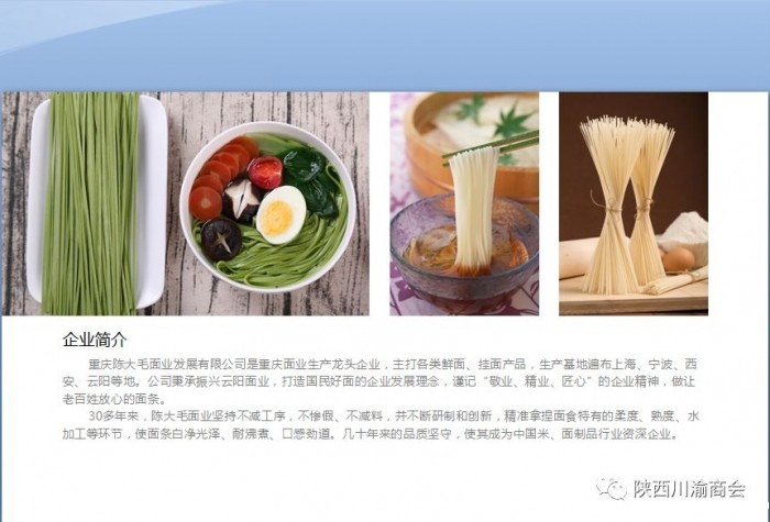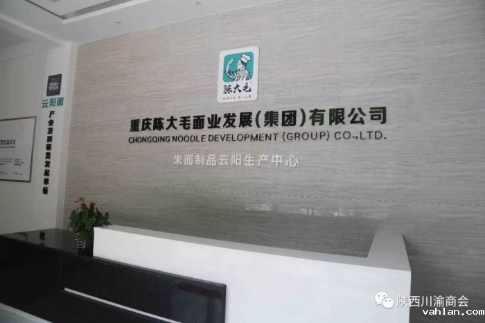 2016年1月,重庆陈大毛面业发展(集团)有限公司成立于云阳,在重庆渝中区、两江新区、湖北武汉、西安、杭州、宁波、上海、北京等地下设各类分支机构。9月,公司投资6000余万元在云阳工业园区人和组团建设了工厂,一期项目占地 6000余平方米,建设有挂面生产线1条,熟面生产线1条,鲜面生产线1条,占地600平方米的面工培训车间一个,主要生产各类高低档婚庆面、寿宴面、养生面、旅游面制品等20余个品种。