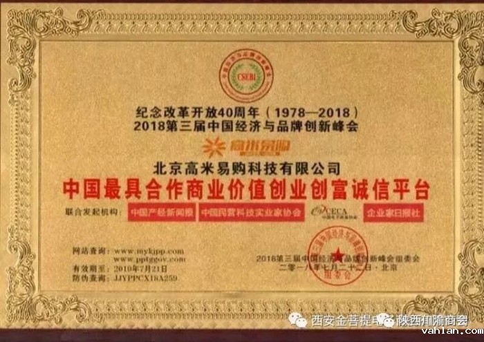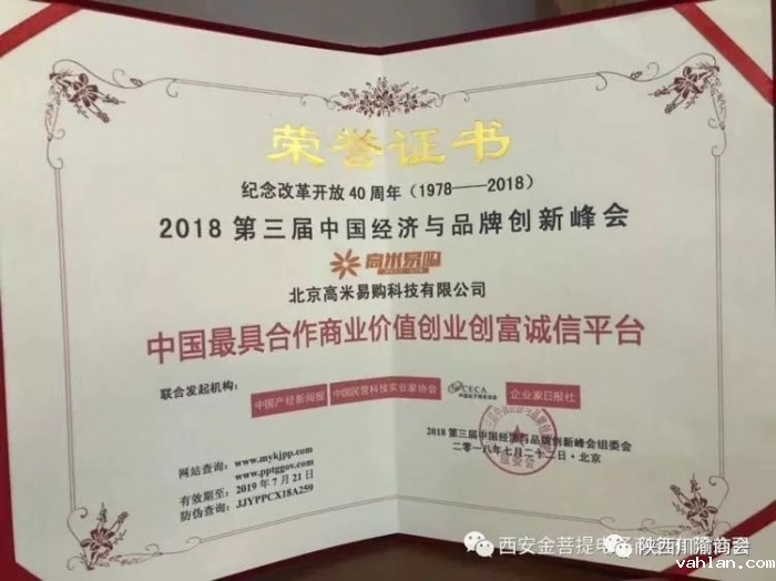 2018年7月 高米易购科技有限公司荣获中国合作商业价值创业创富诚信平台奖项。